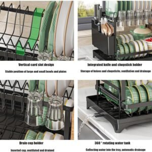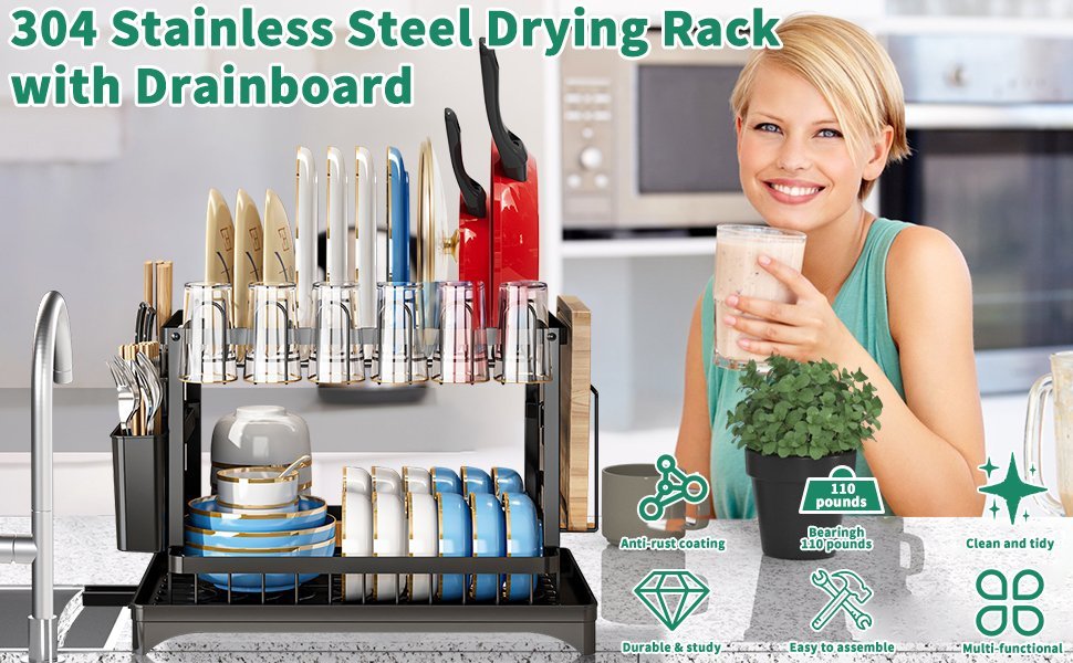 - Our new upgraded extra large dish drying rack is designed with 304 stainless steel and has enough space for cutlery, plates, bowls, glasses, cutlery and more.
